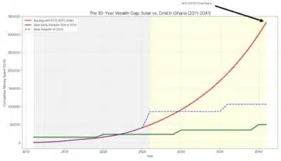 • ​The Future (2026–2041): This is where the gap becomes life-changing. Because grid prices are rising by an average of 10% or more each year, the “red line” curves upward like a rocket. By 2041, the grid-dependent household will have spent nearly GHS 800,000 on electricity alone.